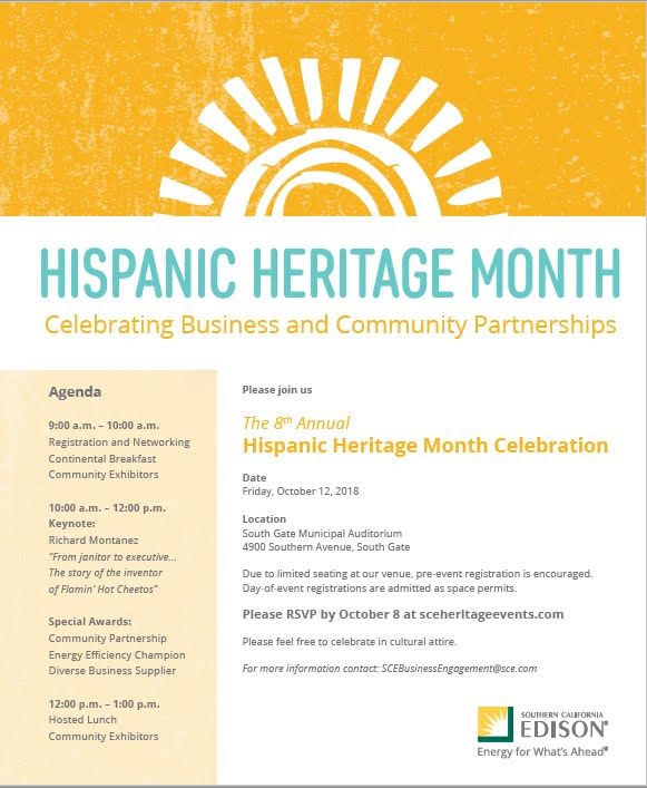 8th Annual Hispanic Heritage Month Celebration October 9, 2018 admin Leave a comment Calendar When: October 12, 2018 @ 9:00 am – 1:00 pm 2018-10-12T09:00:00-07:00 2018-10-12T13:00:00-07:00 Where: South Gate Municipal Auditorium 4900 Southern Ave. South Gate Cost: Free Contact: Event website