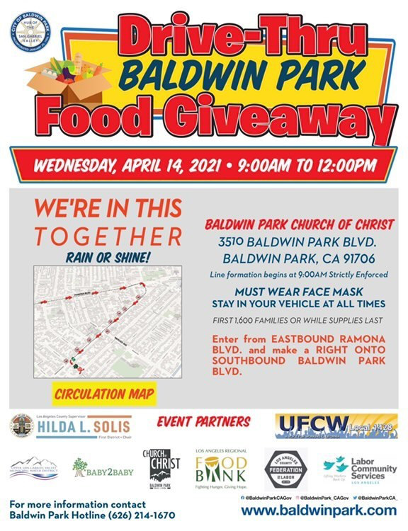 Baldwin Park Drive Thru Food Giveaway April 9, 2021 admin Calendar When: April 14, 2021 @ 9:00 am – 12:00 pm 2021-04-14T09:00:00-07:00 2021-04-14T12:00:00-07:00 Where: Baldwin Park Church of Christ 3510 Baldwin Park. Blvd. Baldwin Park CA 91706 Cost: Free Contact: Event website