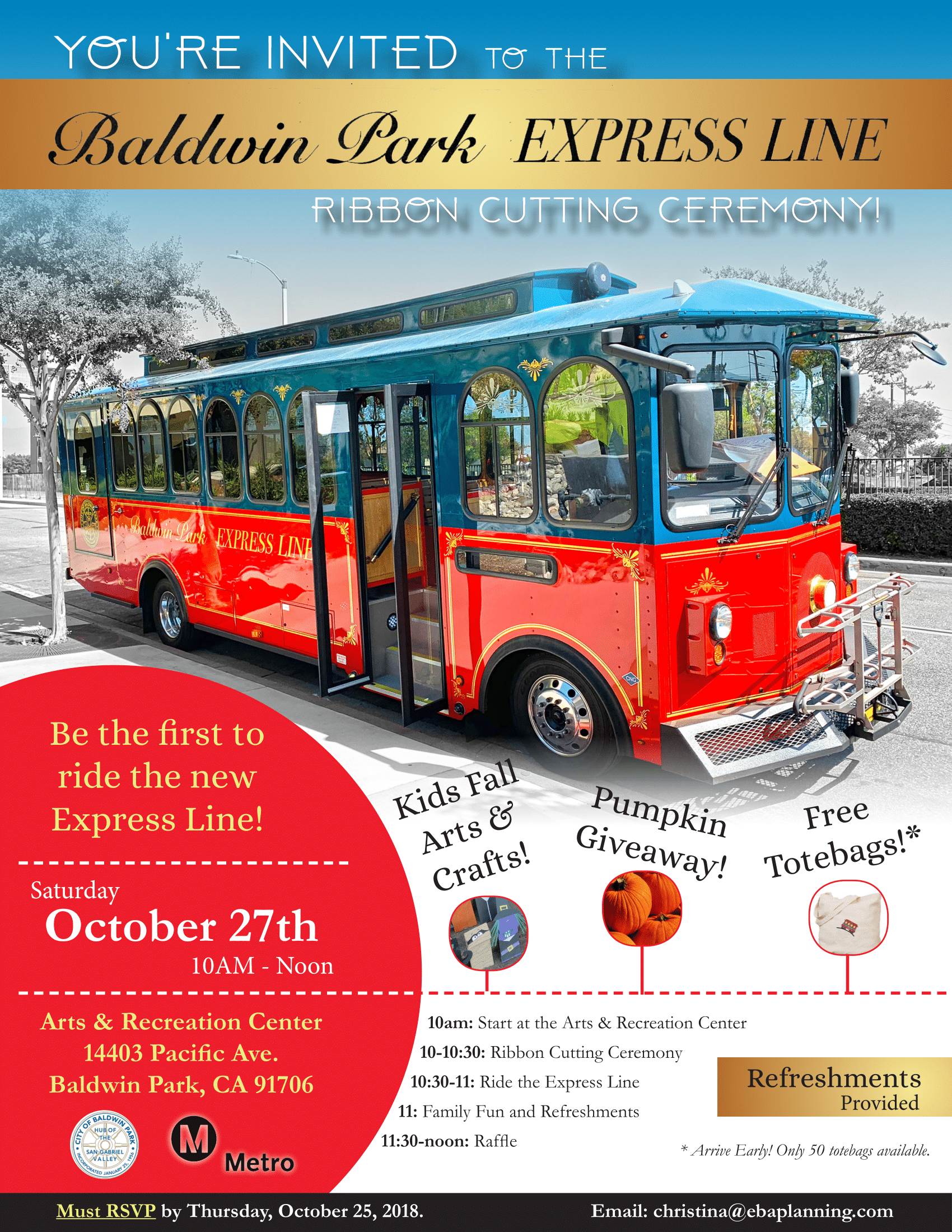 Baldwin Park Express Lane Ribbon Cutting October 18, 2018 admin Calendar When: October 27, 2018 @ 10:00 am – 12:00 pm 2018-10-27T10:00:00-07:00 2018-10-27T12:00:00-07:00 Where: 14403 Pacific Ave. Baldwin Park Cost: Free