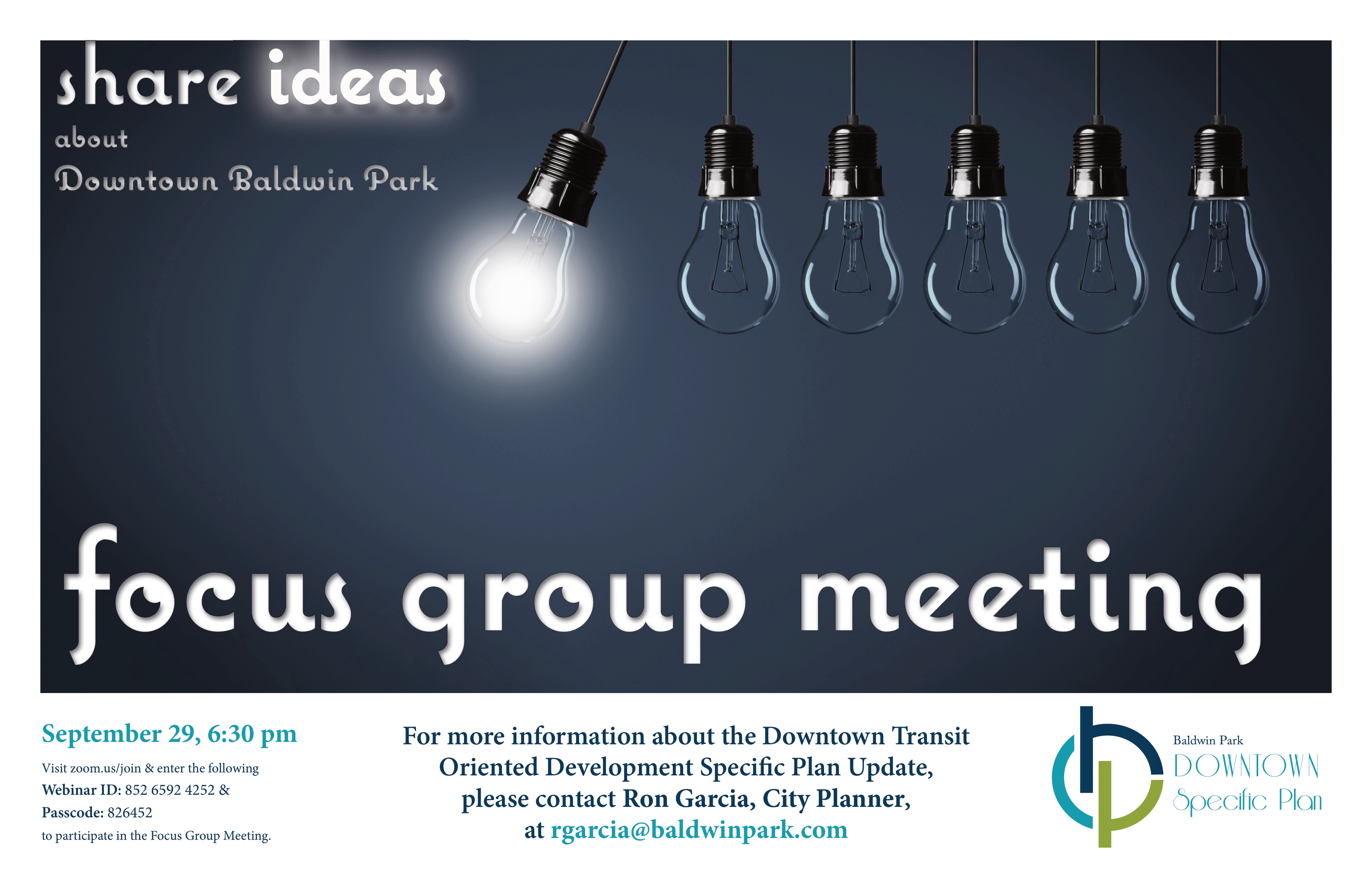 Baldwin Park Focus Group Meeting September 20, 2020 admin Leave a comment Calendar When: September 29, 2020 @ 6:30 pm 2020-09-29T18:30:00-07:00 2020-09-29T18:45:00-07:00 Cost: Free Contact: Email