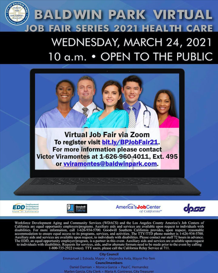Baldwin Park Virtual Job Fair March 12, 2021 admin Calendar When: March 24, 2021 @ 10:00 am 2021-03-24T10:00:00-07:00 2021-03-24T10:15:00-07:00 Cost: Free Contact: Event website