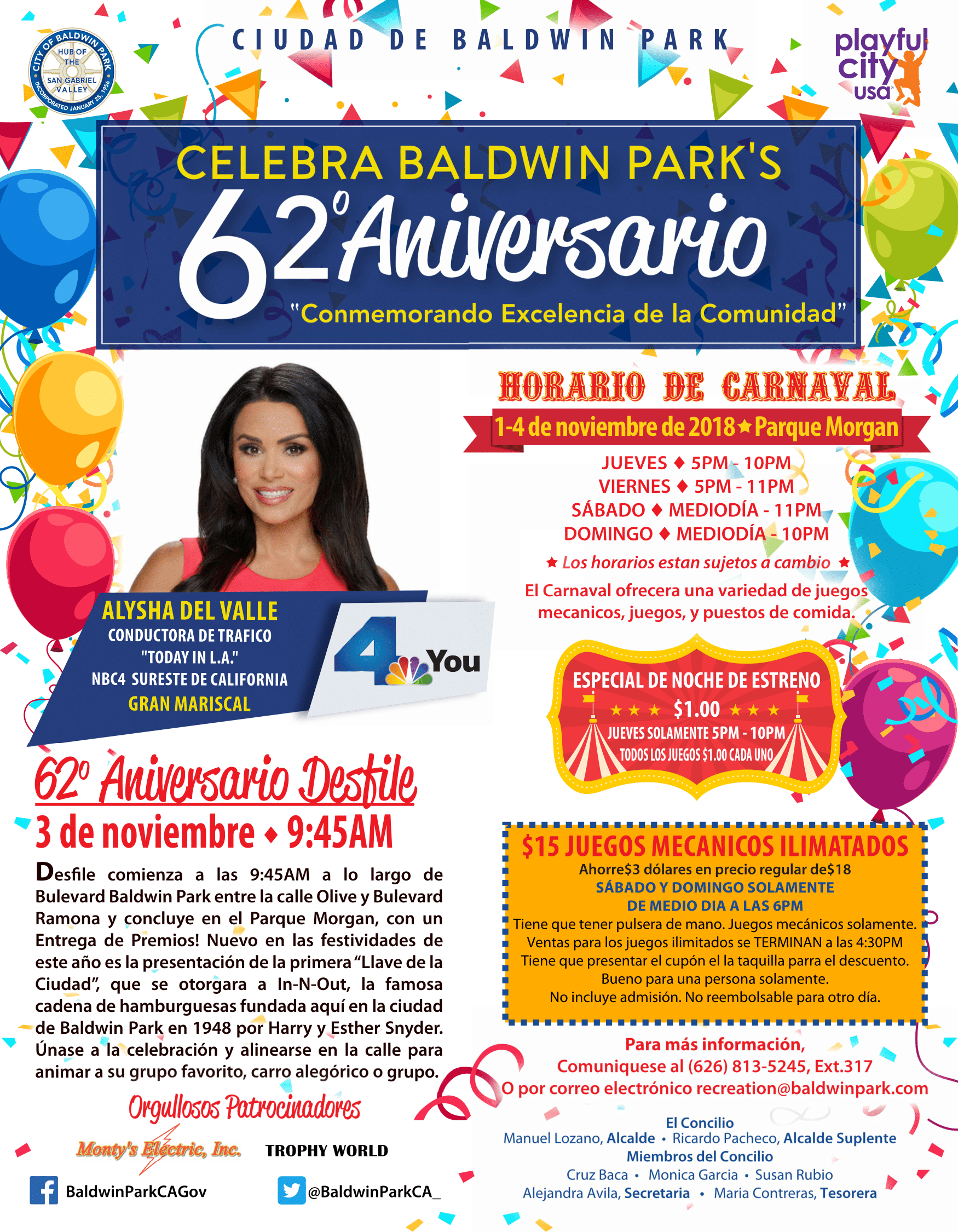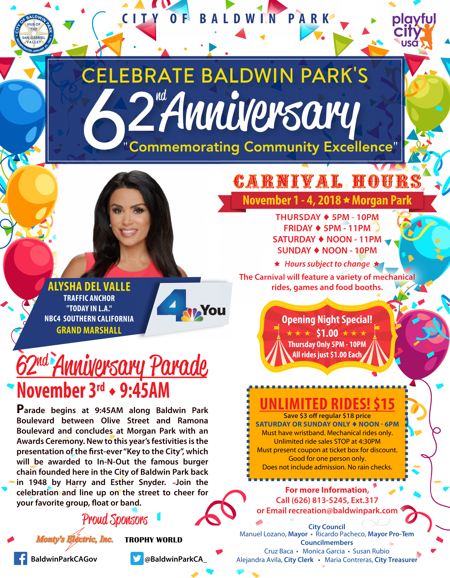 Baldwin Park’s 62nd Anniversary Carnival October 30, 2018 admin Calendar When: November 1, 2018 – November 4, 2018 all-day 2018-11-01T00:00:00-07:00 2018-11-05T00:00:00-08:00 Where: Morgan Park