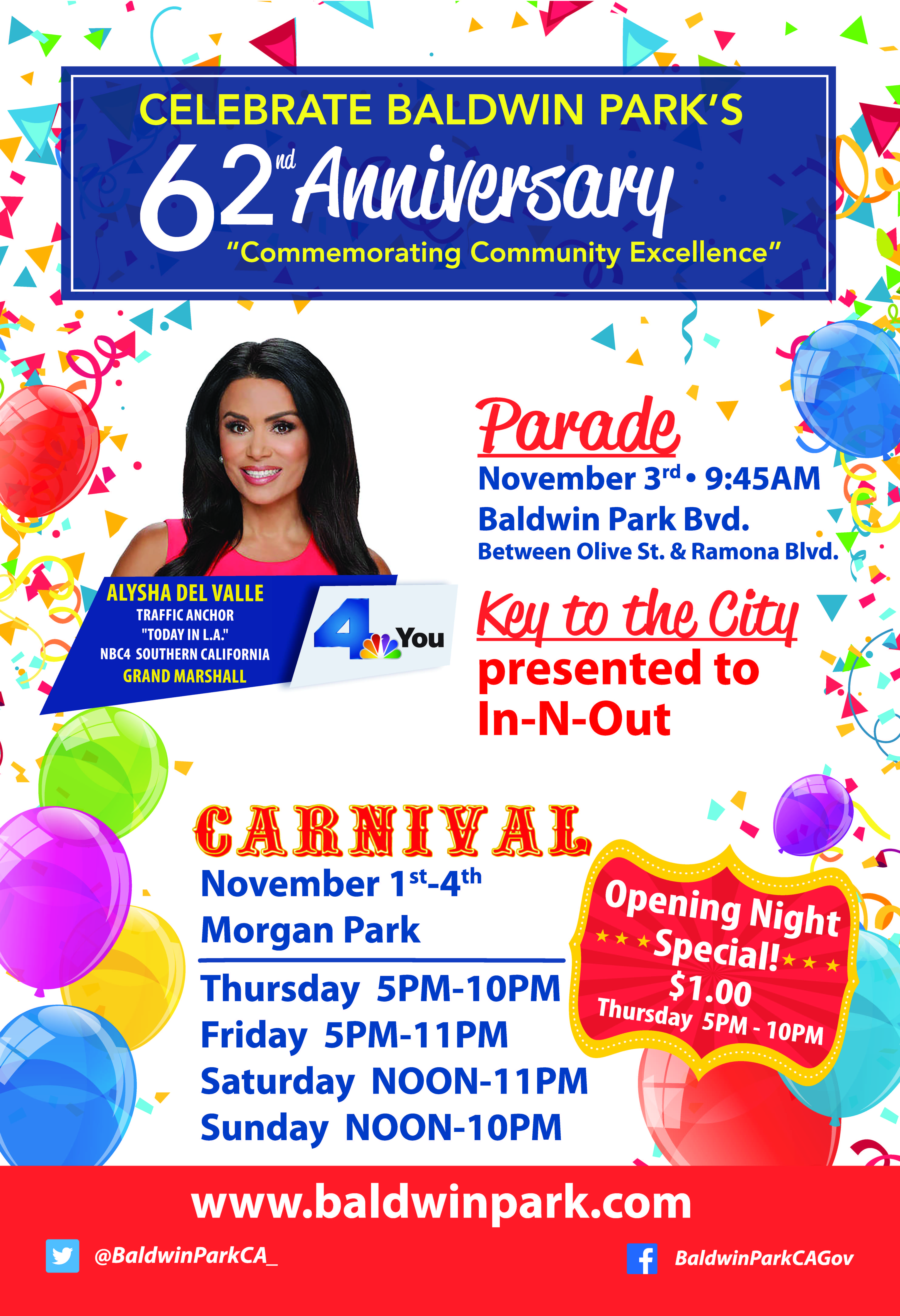 Baldwin Park’s 62nd Anniversary Celebration Parade October 30, 2018 admin Calendar When: November 3, 2018 @ 9:45 am 2018-11-03T09:45:00-07:00 2018-11-03T10:00:00-07:00 Where: Baldwin Park Blvd. (Between Olive St. and Ramona Blvd.) Cost: Free