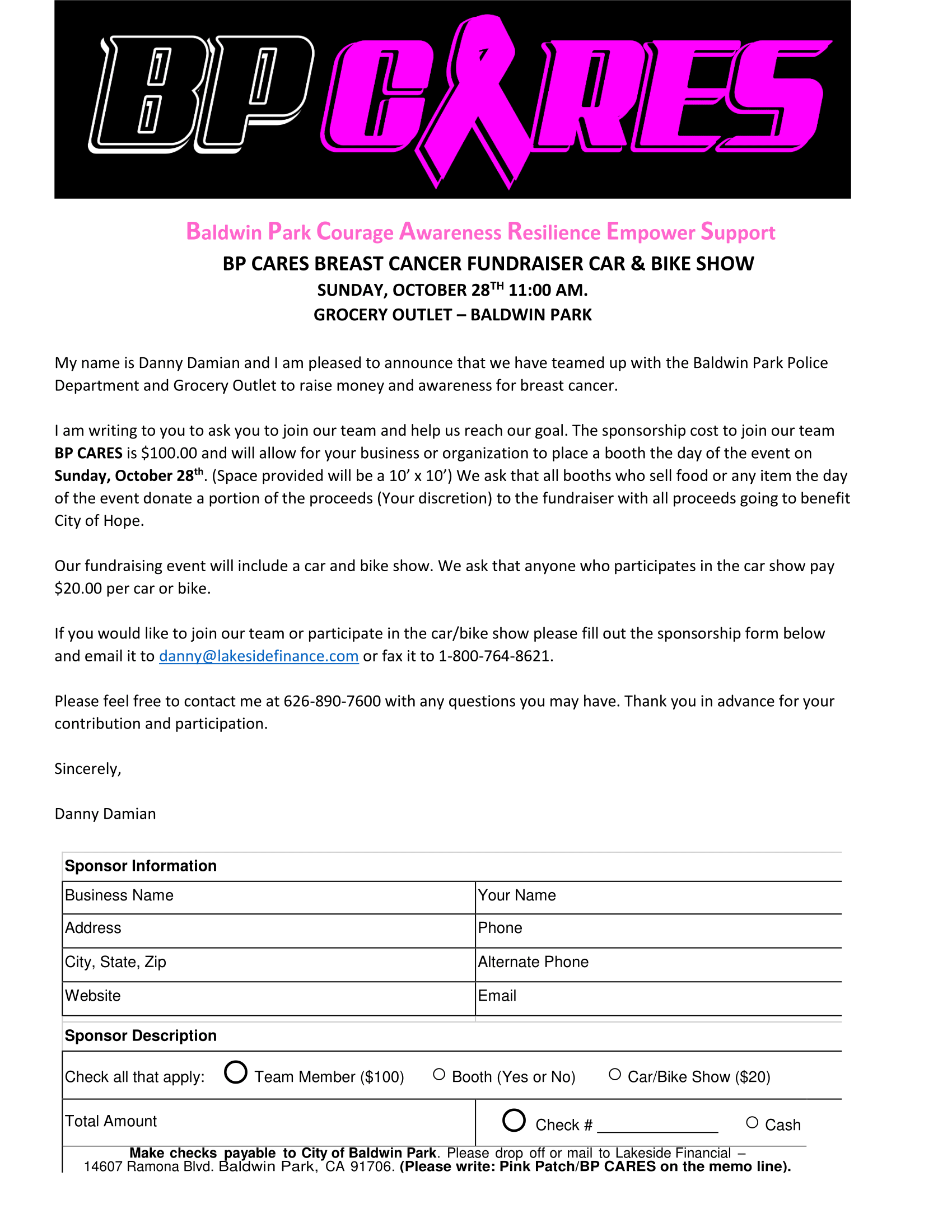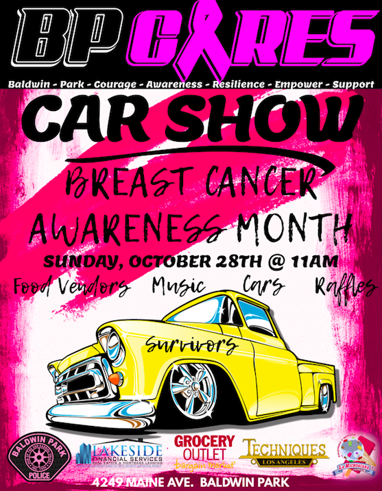 BP CARES Car Show Breast Cancer Fundraiser September 29, 2018 admin Calendar When: October 28, 2018 @ 11:00 am 2018-10-28T11:00:00-07:00 2018-10-28T11:15:00-07:00 Where: 4249 Maine Ave. Baldwin Park CA 91706