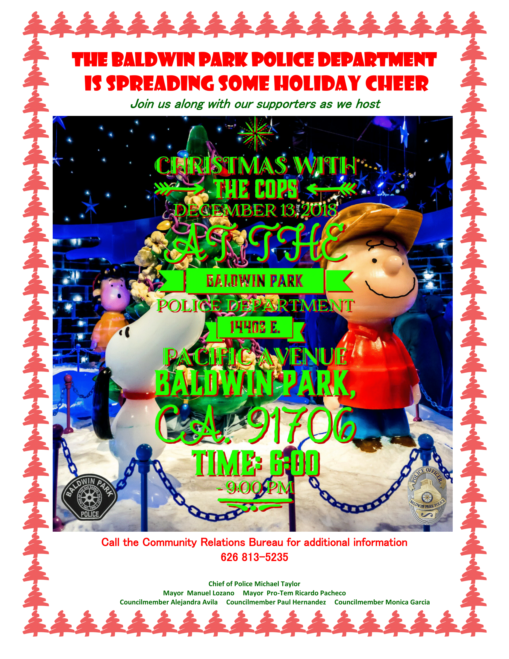 Christmas with the Cops December 3, 2018 admin Leave a comment Calendar When: December 13, 2018 @ 6:00 pm – 9:00 pm 2018-12-13T18:00:00-08:00 2018-12-13T21:00:00-08:00 Where: Baldwin Park Police Department 14403 E. Pacific Ave. Baldwin Park CA Cost: Free Contact: 626-813-5235