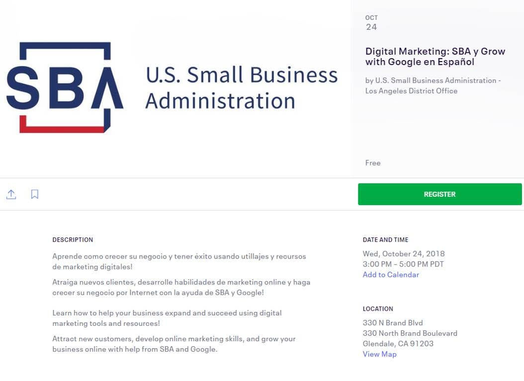 Digital Marketing Workshop October 18, 2018 admin Calendar When: October 24, 2018 @ 3:00 pm – 5:00 pm 2018-10-24T15:00:00-07:00 2018-10-24T17:00:00-07:00 Where: 330 N Brand Blvd. Glendale CA Cost: Free Contact: Event website