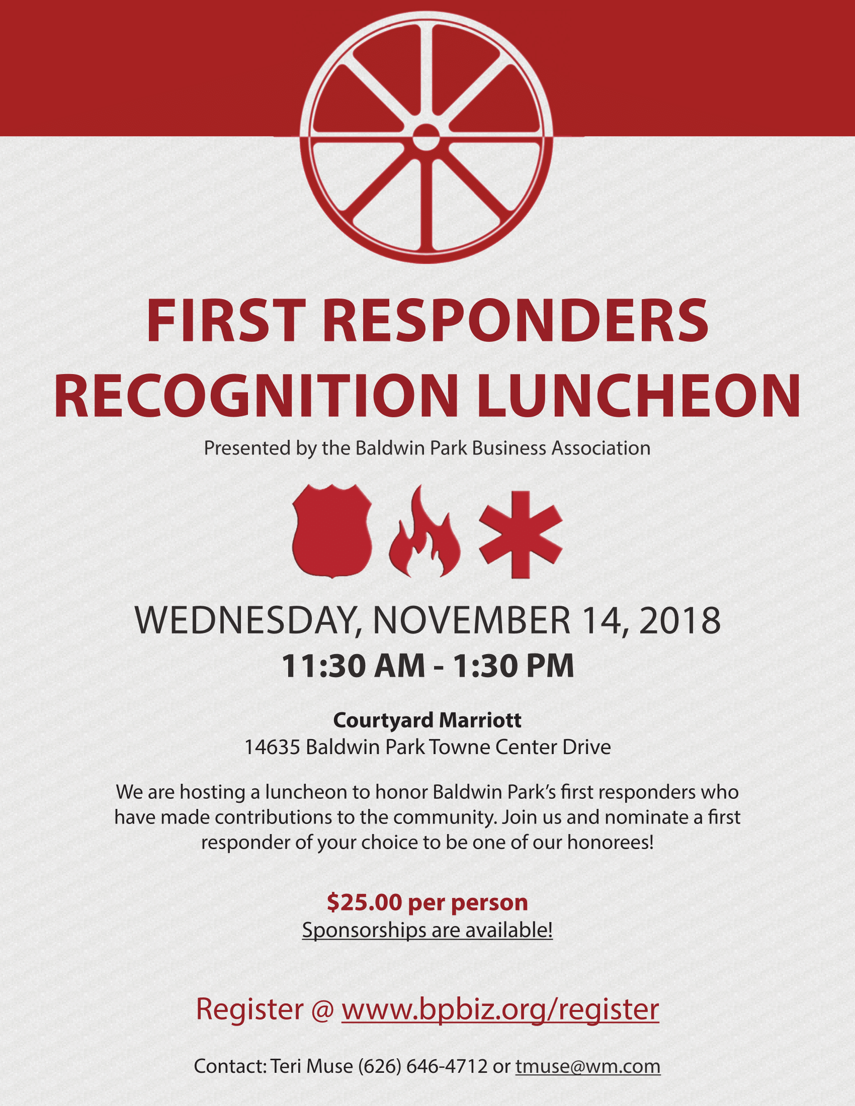 First Responders Recognition Luncheon September 2, 2018 admin Leave a comment Calendar When: November 14, 2018 @ 11:30 am – 1:30 pm 2018-11-14T11:30:00-08:00 2018-11-14T13:30:00-08:00 Where: Courtyard Marriott 14635 Baldwin Park Towne Center Drive Baldwin Park CA 91706 Cost: $25.00 Contact: Teri Muse 626-646-4712 Email Event website