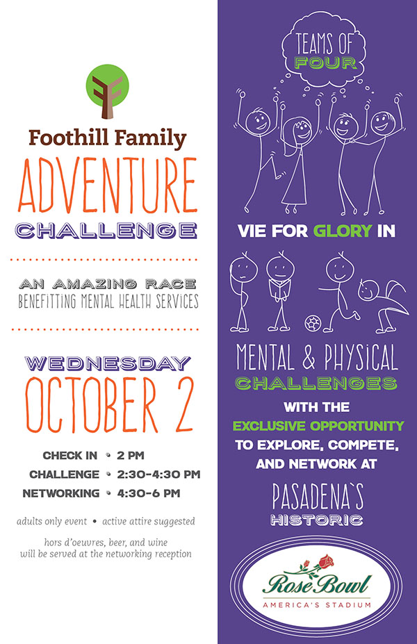 Foothill Family Adventure Challenge 2019 August 13, 2019 admin Calendar Tickets When: October 2, 2019 @ 2:00 pm – 6:00 pm 2019-10-02T14:00:00-07:00 2019-10-02T18:00:00-07:00 Where: Rose Bowl 1001 Rose Bowl Dr. Pasadena CA 91103 Contact: Email Event website Foothill Family Adventure Challenge 2019 Flyer