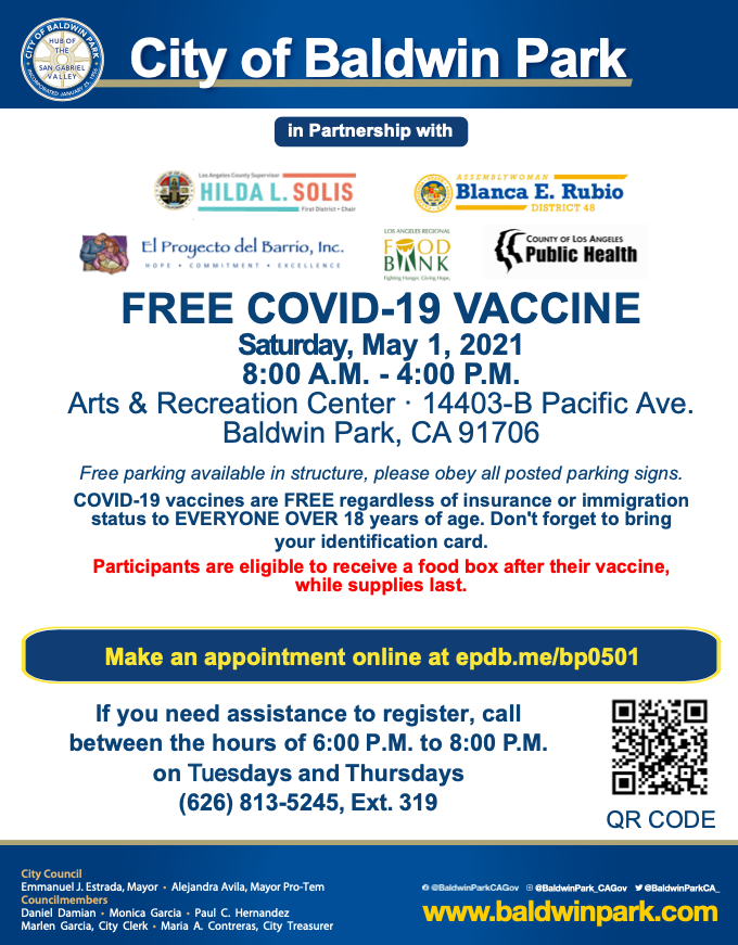 Free COVID-19 Vaccine April 25, 2021 admin Calendar When: May 1, 2021 @ 8:00 am – 4:00 pm 2021-05-01T08:00:00-07:00 2021-05-01T16:00:00-07:00 Where: Arts & Recreation Center 14403-B Pacific Ave. Baldwin Park CA 91706 Cost: Free Contact: Event website
