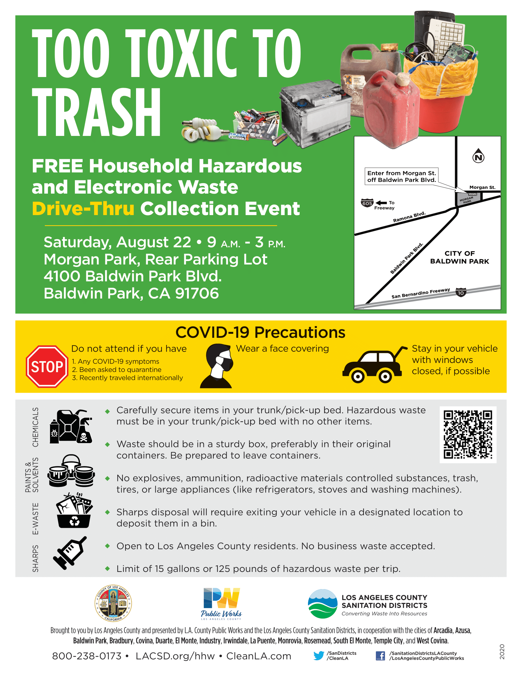 FREE Household Hazardous Waste & E-Waste Drive-Thru Collection Event August 16, 2020 admin Calendar When: August 22, 2020 @ 9:00 am – 3:00 pm 2020-08-22T09:00:00-07:00 2020-08-22T15:00:00-07:00 Where: Morgan Park, Rear Parking Lot 4100 Baldwin Park Blvd. Baldwin Park CA 91706 Cost: Free