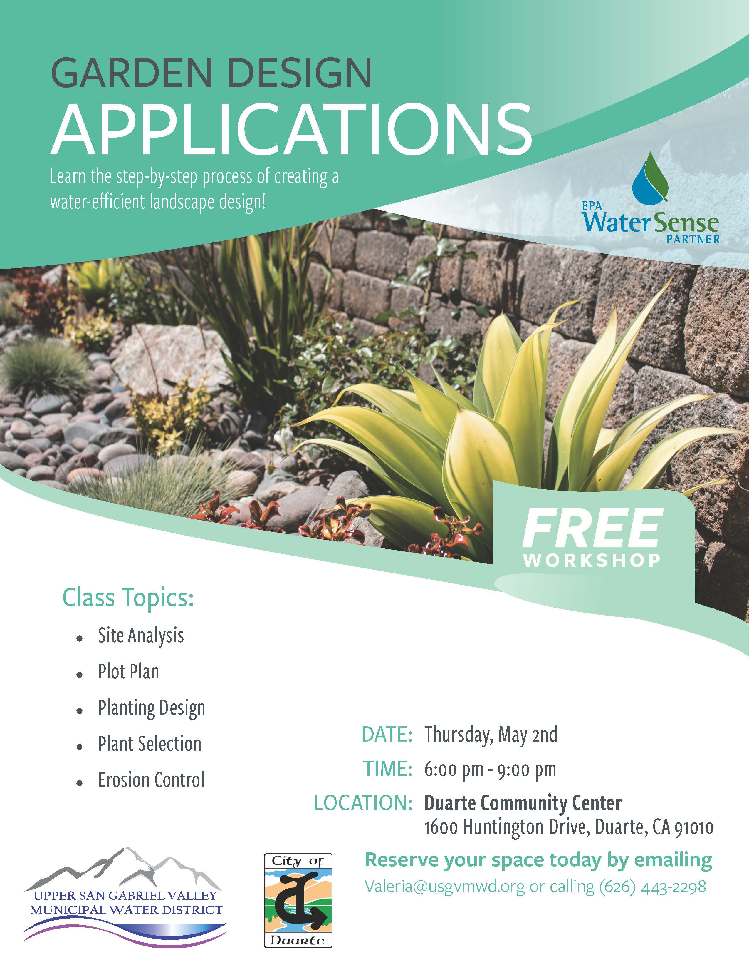 Garden Design Applications April 14, 2019 admin Calendar When: May 2, 2019 @ 6:00 pm – 9:00 pm 2019-05-02T18:00:00-07:00 2019-05-02T21:00:00-07:00 Where: Duarte Community Center 1600 Huntington Dr. Duarte CA 91010 Contact: Email