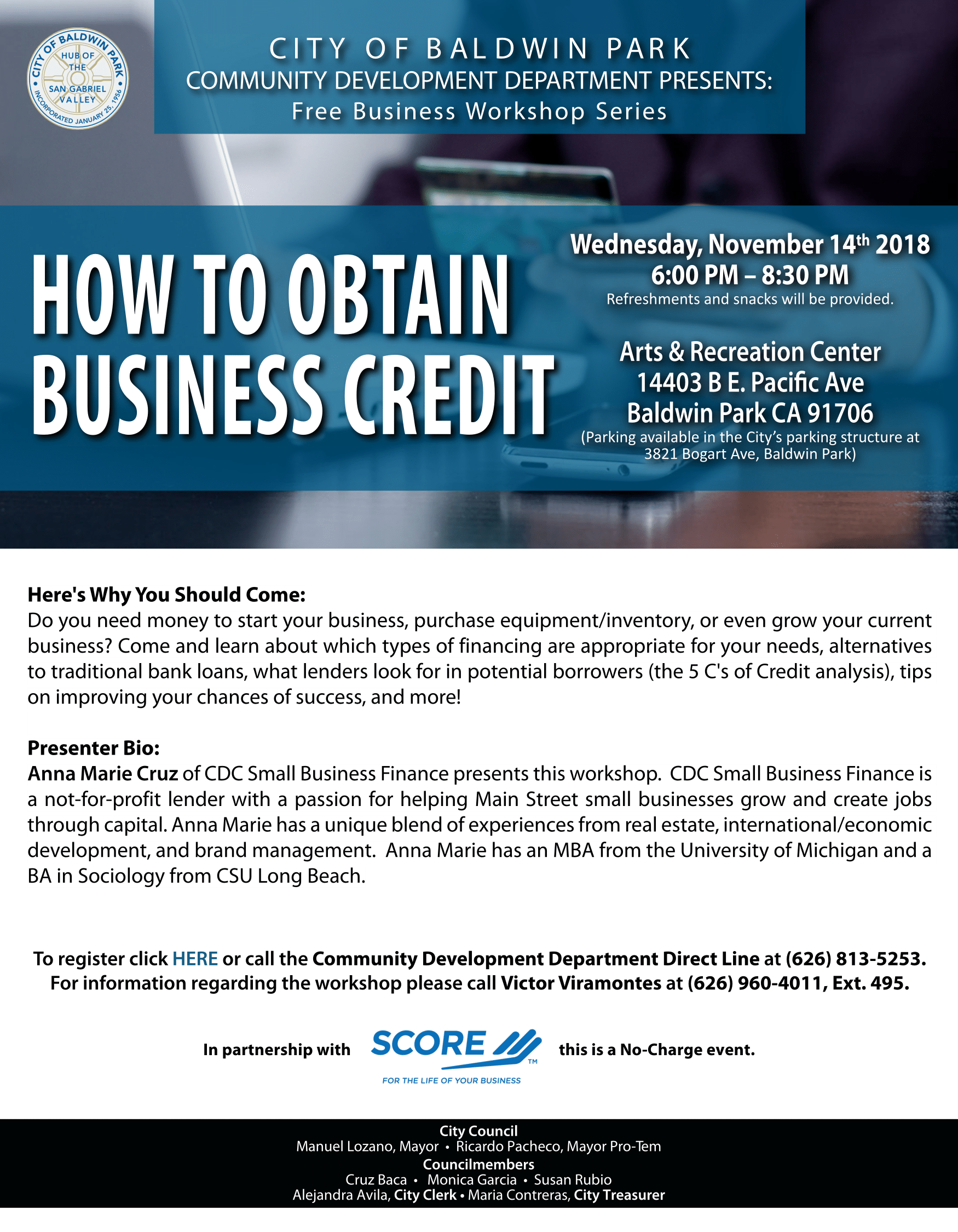 How to Obtain Business Credit October 30, 2018 admin Calendar When: November 14, 2018 @ 6:00 pm – 8:30 pm 2018-11-14T18:00:00-08:00 2018-11-14T20:30:00-08:00 Where: Arts & Recreation Center 14403 B E. Pacific Ave. Baldwin Park CA 91706 Cost: Free Contact: Event website