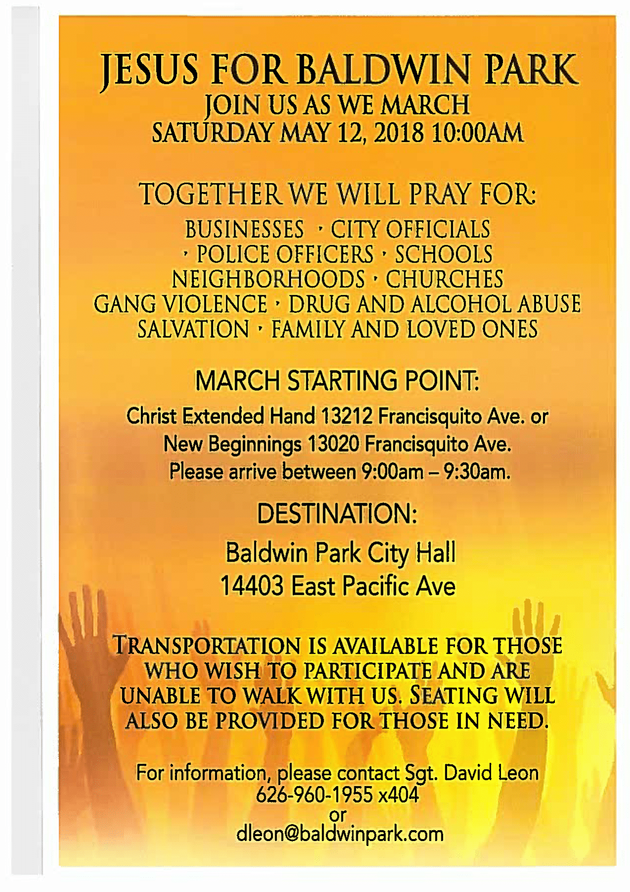 Jesus for Baldwin Park March April 13, 2018 admin Calendar When: May 12, 2018 @ 10:00 am 2018-05-12T10:00:00-07:00 2018-05-12T10:15:00-07:00 Contact: Sgt. David Leon 626-960-1955 x404 Email