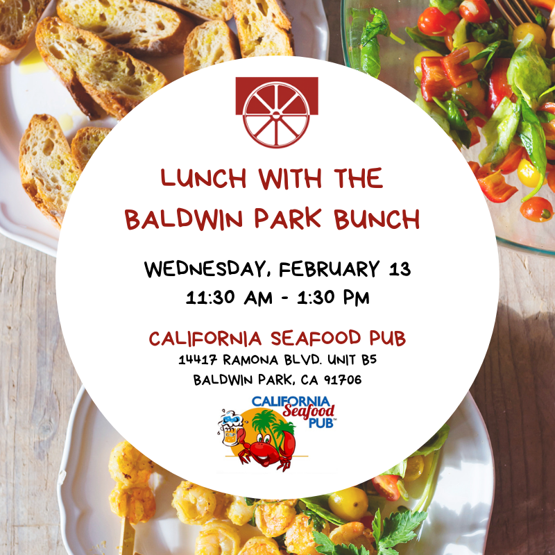 Lunch With the Baldwin Park Bunch February 3, 2019 admin Calendar When: February 13, 2019 @ 11:30 am – 1:30 pm 2019-02-13T11:30:00-08:00 2019-02-13T13:30:00-08:00 Where: California Seafood Pub 14417 Ramona Blvd Unit B5, Baldwin Park CA 91706