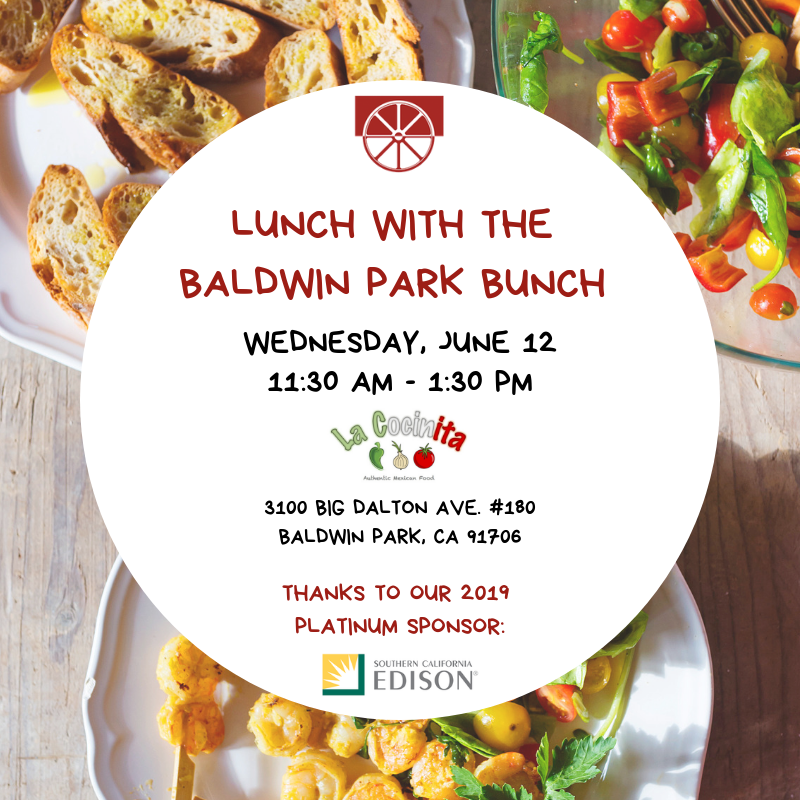 Lunch with the Baldwin Park Bunch May 20, 2019 admin Calendar When: June 12, 2019 @ 11:30 am – 1:30 pm 2019-06-12T11:30:00-07:00 2019-06-12T13:30:00-07:00 Where: La Cocinita 3100 Big Dalton Ave. #180 Baldwin Park CA 91706 Cost: Free