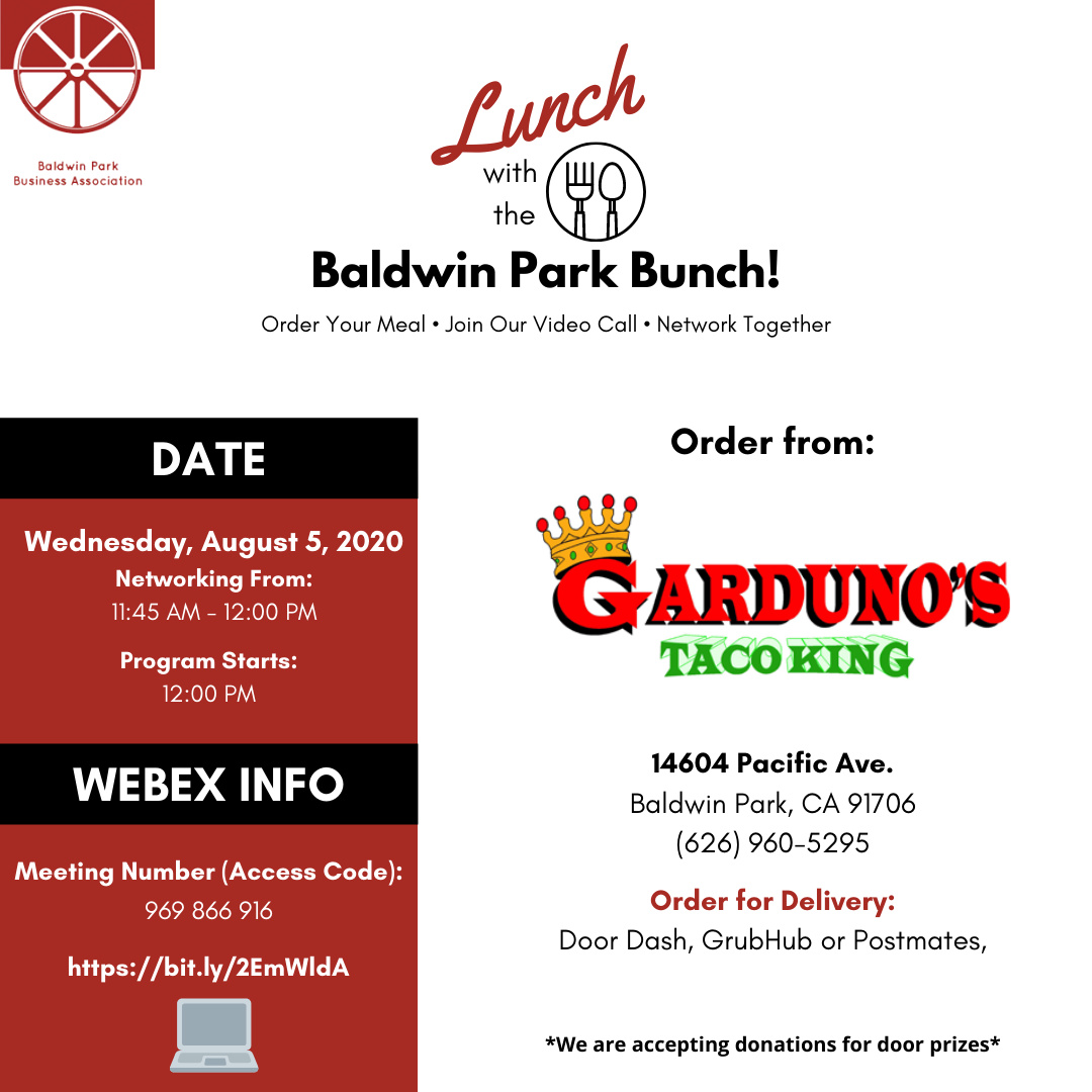 Lunch With the Baldwin Park Bunch July 27, 2020 admin Calendar When: August 5, 2020 @ 11:30 am – 1:00 pm 2020-08-05T11:30:00-07:00 2020-08-05T13:00:00-07:00 Cost: Free Contact: Event website