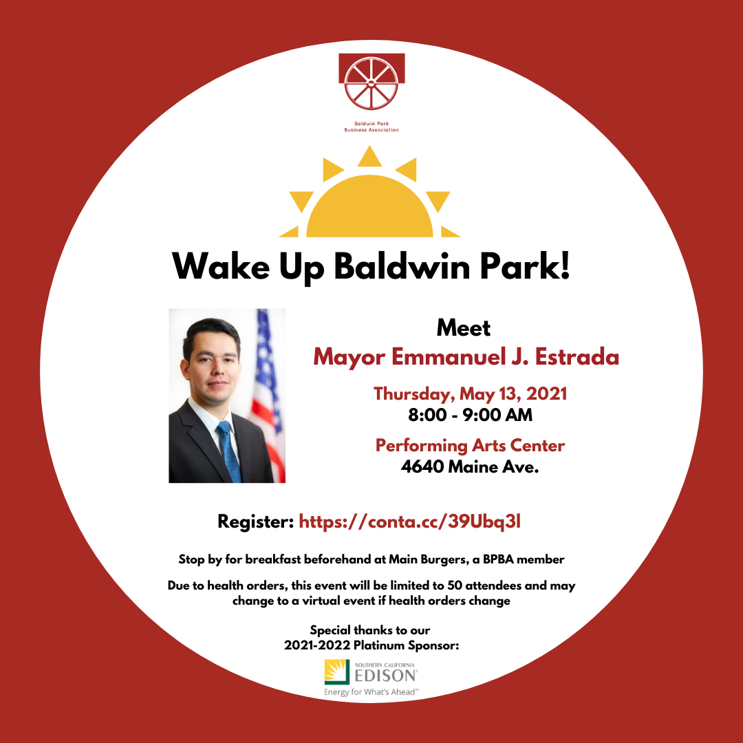 May Wake Up Baldwin Park! April 2, 2021 admin Calendar When: May 13, 2021 @ 8:00 am – 9:00 am 2021-05-13T08:00:00-07:00 2021-05-13T09:00:00-07:00 Where: Performing Arts Center of Baldwin Park 4640 Maine Ave. Baldwin Park CA 91706 Cost: Free Contact: Event website Submit Questions for the Mayor Here