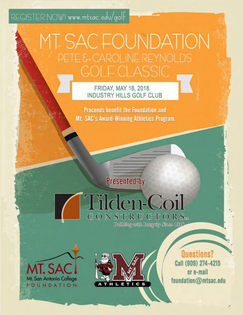 Mt. Sac Foundation: Pete & Caroline Reynolds Golf Classic April 12, 2018 admin Leave a comment Calendar When: May 18, 2018 all-day 2018-05-18T00:00:00-07:00 2018-05-19T00:00:00-07:00 Where: Industry Hills Golf Club Contact: Event website
