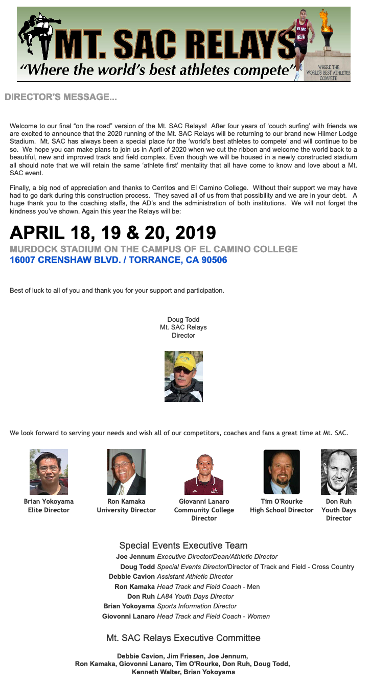Mt. Sac Relays April 14, 2019 admin Calendar When: April 18, 2019 – April 20, 2019 all-day 2019-04-18T00:00:00-07:00 2019-04-21T00:00:00-07:00 Where: El Camino College - Murdock Stadium 16007 Crenshaw Blvd. Torrance CA 90506