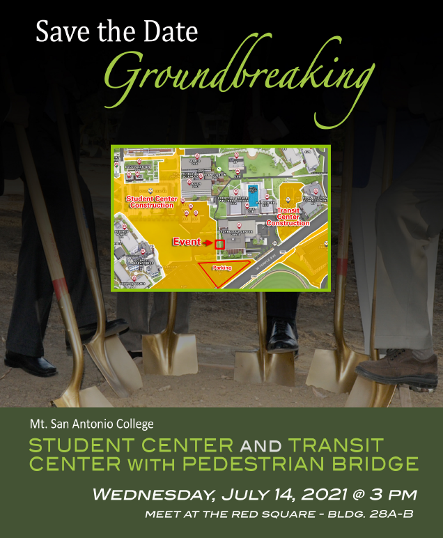 Mt. SAC Student Center Groundbreaking July 5, 2021 admin Calendar When: July 14, 2021 @ 3:00 pm 2021-07-14T15:00:00-07:00 2021-07-14T15:15:00-07:00 Where: Mt. San Antonio College Red Square - BLDG. 28A-B 1100 N Grand Ave Walnut CA 91789 Cost: Free