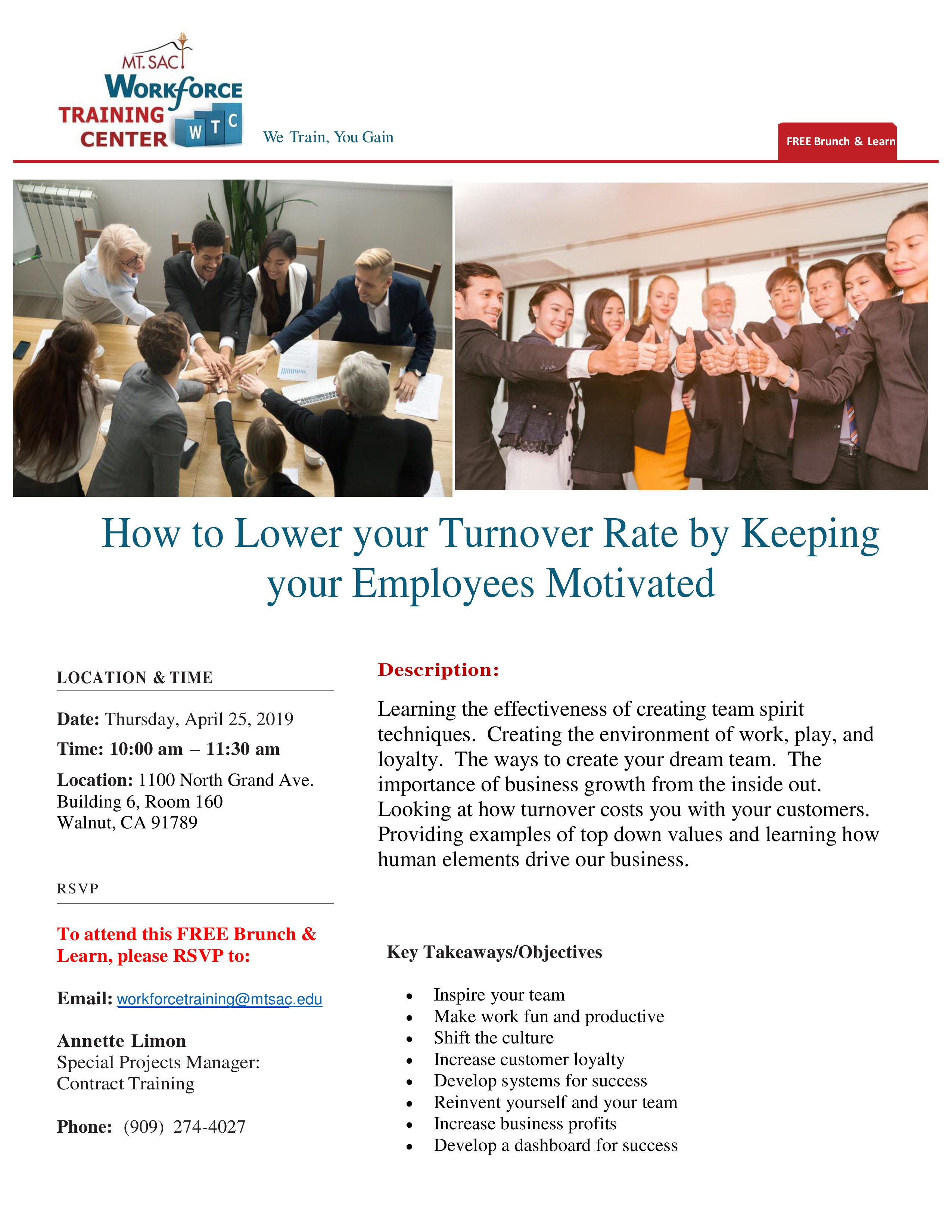Mt. Sac Workforce Training Center: How to Lower your Turnover Rate by Keeping your Employees Motivated April 14, 2019 admin Calendar When: April 25, 2019 @ 10:00 am – 11:30 am 2019-04-25T10:00:00-07:00 2019-04-25T11:30:00-07:00 Where: Mt. Sac: Building Room 6, Room 160 1100 N. Grand Ave. Walnut CA 91789 Cost: Free Contact: Email
