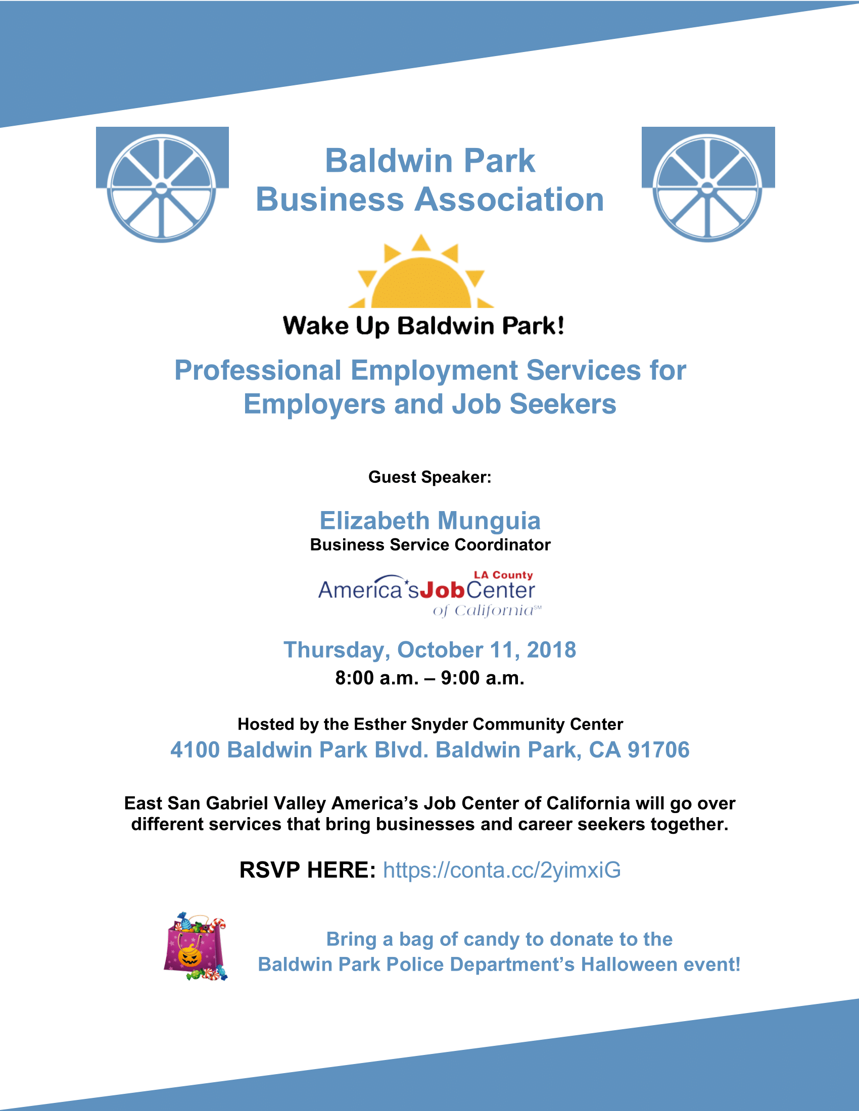 October Wake Up Baldwin Park! October 5, 2018 admin Leave a comment Calendar When: October 11, 2018 @ 8:00 am – 9:00 am 2018-10-11T08:00:00-07:00 2018-10-11T09:00:00-07:00 Where: Esther Snyder Community Center 4100 Baldwin Park Blvd. Baldwin Park CA 91706 Cost: Free Contact: Teri Muse Email Event website