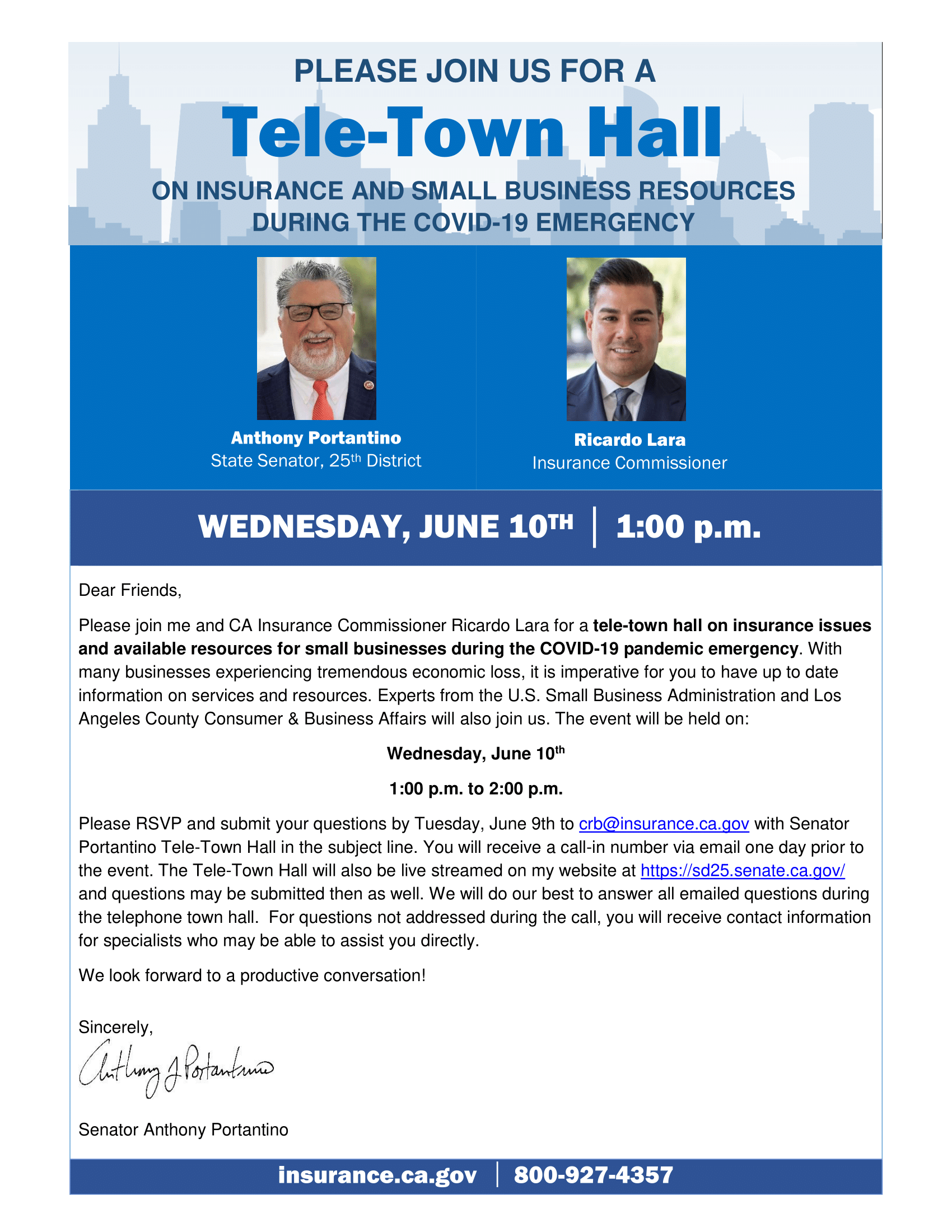 Senator Portantino Tele-Town Hall June 8, 2020 admin Calendar When: June 10, 2020 @ 1:00 pm – 2:00 pm 2020-06-10T13:00:00-07:00 2020-06-10T14:00:00-07:00 Cost: Free Contact: Email Event website