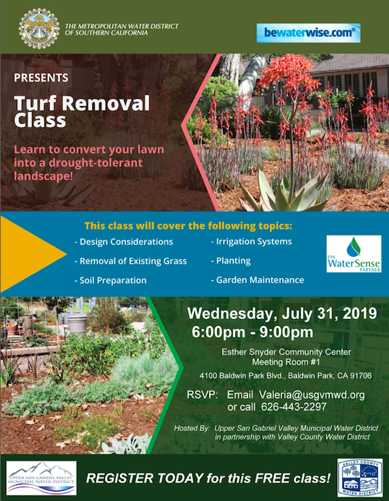 Turf Removal Class June 9, 2019 admin Calendar When: July 31, 2019 @ 6:00 pm – 9:00 pm 2019-07-31T18:00:00-07:00 2019-07-31T21:00:00-07:00 Where: Esther Snyder Community Center: Meeting Room 1 4100 Baldwin Park Blvd. Baldwin Park CA 91706 Cost: Free Contact: 626-443-2297 Email