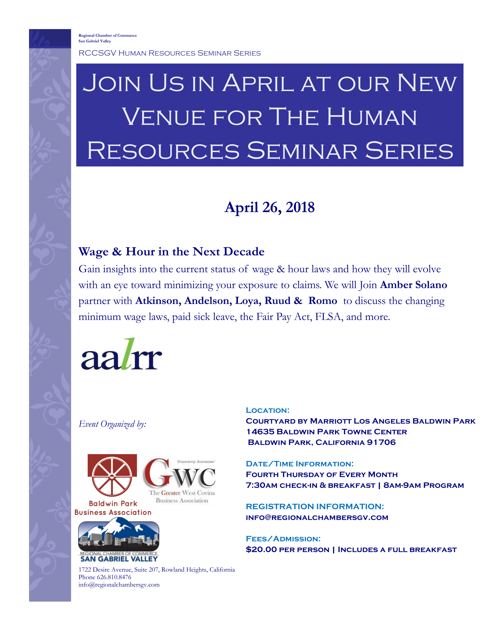 Wages & Hour in the Next Decade Seminar April 19, 2018 admin Calendar Click to view map When: April 26, 2018 @ 7:30 am – 9:00 am 2018-04-26T07:30:00-07:00 2018-04-26T09:00:00-07:00 Where: Courtyard Marriott 14635 Baldwin Park Towne Center Baldwin Park CA 91706 Cost: 20.00
