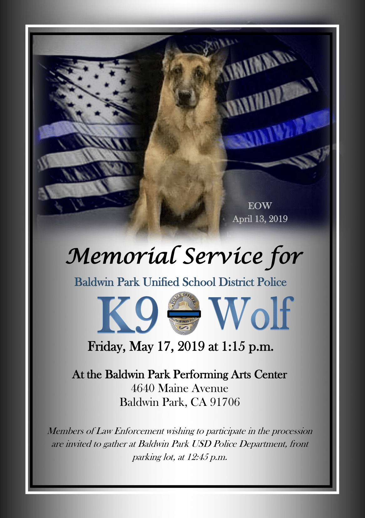 Wolf K9 Memorial Service May 12, 2019 admin Calendar When: May 17, 2019 @ 1:15 pm 2019-05-17T13:15:00-07:00 2019-05-17T13:30:00-07:00 Where: Baldwin Park Performing Arts Center 4640 Maine Ave. Baldwin Park CA 91706